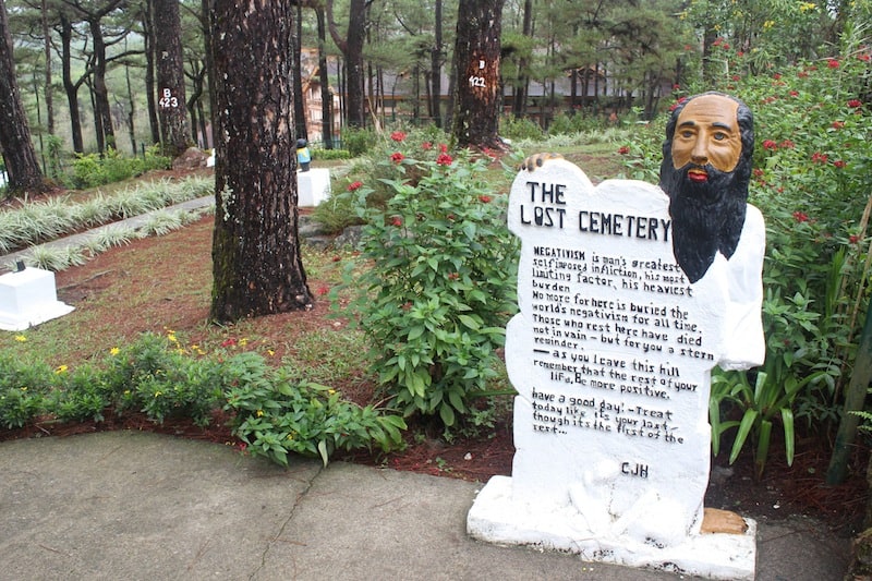 Adorning one slope of a hill at Camp John Hay, the Cemetery of Negativism (also known as the Lost Cemetery) is part of the camp’s Historical Core. Established by the base’s commanding general John Hightower in the early 1980s, it is a symbolic site for the burying of negativities — thoughts, emotions, attitude — or, as we usually call them collectively today, bad vibes.