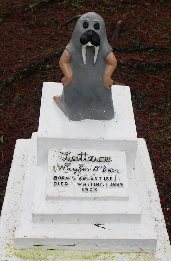 A walkway made of stone cuts through a red, pine needle-covered ground, allowing visitors to have a closer look at each of the inspirational and enlightening yet oddly hilarious gravestones. One bears the name “Kant B. Done,” said to be born on January 2, 1904 and died on January 1, 1904, a day before he was supposed to be born. On another marker was “Why Dident I,” above an unknown birth date and words, “Lived wondering why. Died for no reason.”