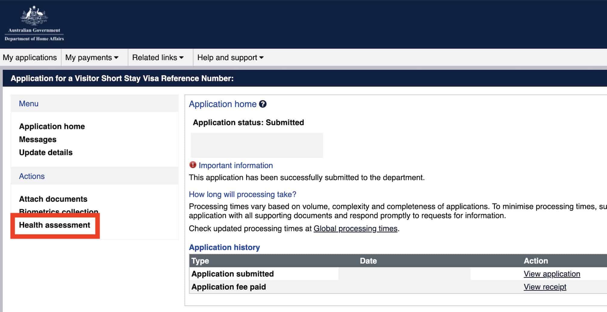 If you need to undergo medical or health examinations, you will see a link called ‘Organise health examinations‘.